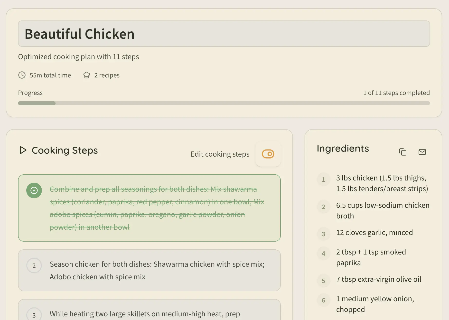 AI creates optimized cooking plans using all the recipes you select for perfectly efficient cooking