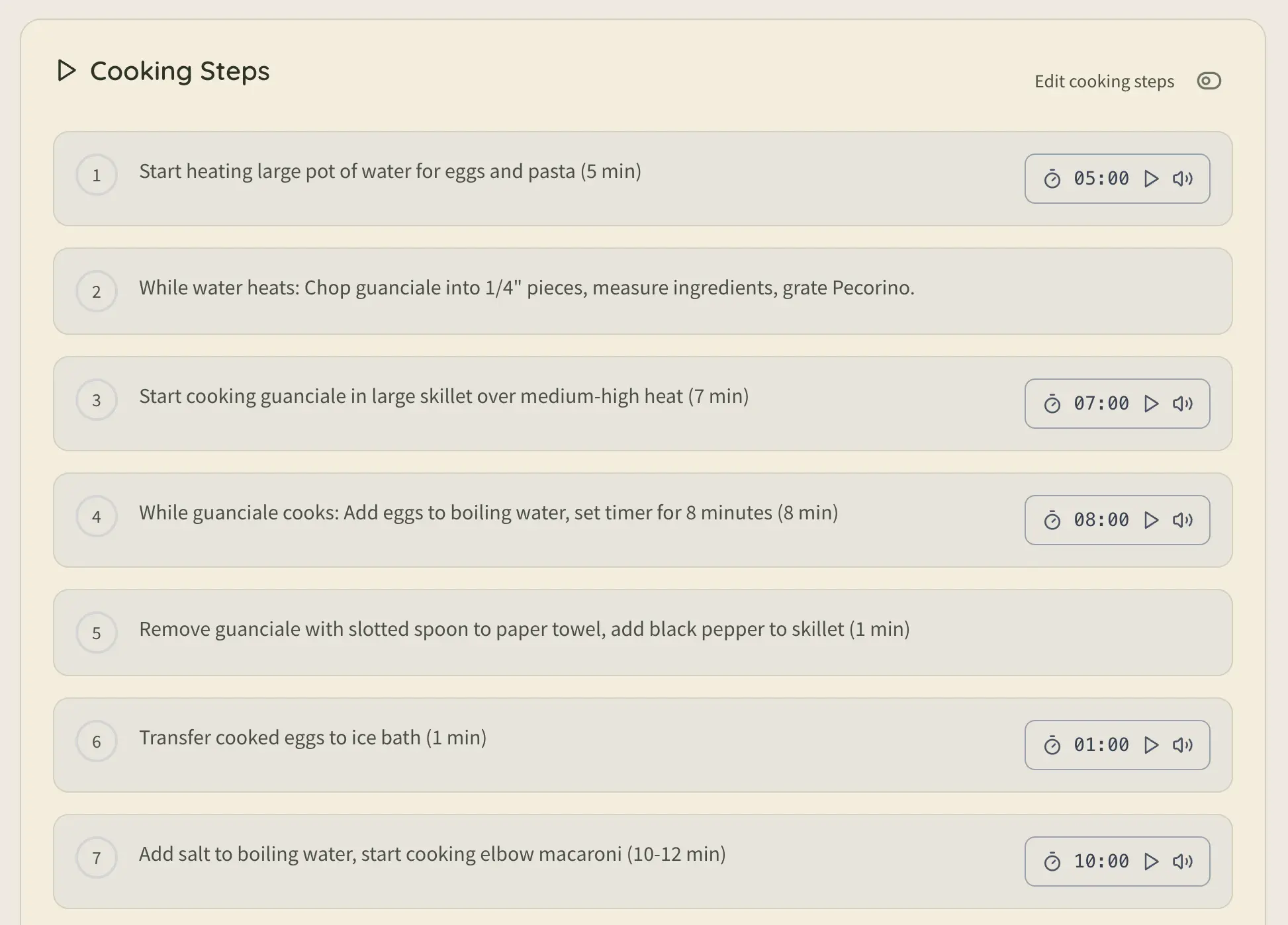 Smart cooking timers that guide you through each recipe step, with notifications and automatic transitions.